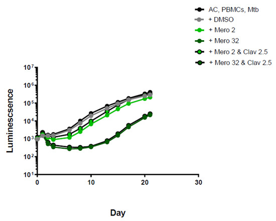 All drugs were dissolved in DMSO (except clavulanate, which was dissolved in distilled water). Stock solutions were filter-sterilised and frozen at −80 °C in 500 µL aliquots. Experiments were carried out in triplicate and performed on PBMCs from at least two separate donors on separate occasions. All drugs were dissolved in DMSO (except clavulanate, which was dissolved in distilled water). Stock solutions were filter-sterilised and frozen at −80 °C in 500 µL aliquots. Bacterial luminescence was monitored for at least 21 days. Standard deviations are included in Figures but were very small, i.e., within the size of the points on the curves.