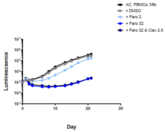 Luminescence detection at different time points for faropenem in TB-infected PMBCs obtained from donor 1. AC: alginate collagen; PMBCs: peripheral blood mononuclear cells; Mtb: Mycobacterium tuberculosis; DMSO: dimethyl sulfoxide; Faro 2: Faropenem 2 mg/L; Faro 32: Faropenem 32 mg/L; Clav 2.5: clavulanic acid 2.5 mg/L. Standard deviation included but are very small, i.e., within the size of the points on the curve.