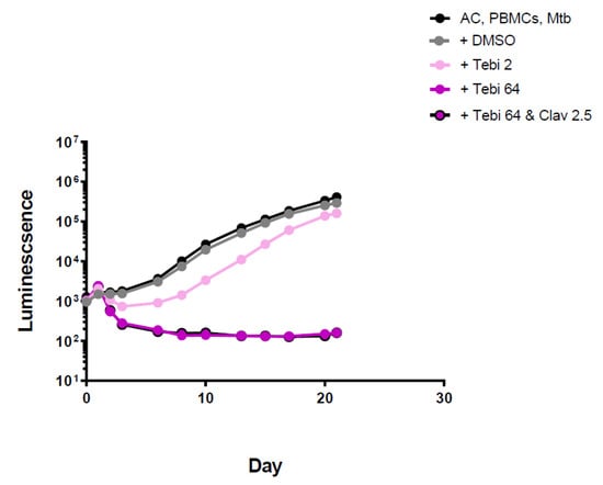 Luminescence detection at different time points for tebipenem in TB-infected PMBCs obtained from donor 1. AC: alginate collagen; PMBCs: peripheral blood mononuclear cells; Mtb: Mycobacterium tuberculosis; DMSO: dimethyl sulfoxide; Tebi 2: Tebipenem 2 mg/L; Tebi 64: Tebipenem 64 mg/L; Clav 2.5: clavulanic acid 2.5 mg/L.