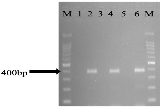 PCR amplification of representative eaeA gene in E. coli isolates isolated from the environment. Lane M: marker 100 bp ladder, lane 6: eaeA ATCC 43887 as positive control, lane 5: E. coli ATCC 11775 as negative control, lanes 2, 4: eaeA, lanes 1, 3: negative.