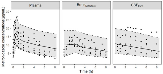 The following supporting information can be downloaded at: https://www.mdpi.com/article/10.3390/antibiotics11101293/s1, Figure S1: Metronidazole concentration-time profiles in plasma, brain dialysates after correction by in vivo probe recovery (BrainDialysate) and collection bag of the EVD (CSFEVD) after the administration of 500 mg q8h. The circles represent the observed data, the dashed lines the individual predictions and the solid lines the population predictions; Figure S2: Predicted concentration-time profiles of metronidazole in plasma, brain ECF, brain dialysates after correction by in vivo probe recovery, CSF in the lateral ventricle (CSFLV) and CSF collected by extra-ventricular drainage (CSFEVD) for a typical patient after administration of 500 mg q8h. The black lines correspond to model predictions from permeability values (PSECF/CSF) calculated from system- and drug-specific paramaters by Simcyp (PScalculated). The blue dashed lines are model predictions from PSECF/CSF estimated by the model (PSestimated), and the red dashed lines are model predictions from PSECF/CSF scaled from in vitro Caco-2 permeability parameters (PSin vitro); Figure S3: Simulation of the impact of increased passive diffusion clearances, PSECF/CSF (a), increased brain ECF volume, VECF (b) and reduced cerebral blood flow, Qbrain (c), on CNS PK profiles of a hypothetical drug with low permeability using the minimal PBPK model. The plots were stratified by the CNS compartments (panels); Figure S4: Simulation of the impact of external ventricular drain flow (QEVD) on CSF concentrations of a hypothetical drug with low permeability. QEVD was assumed to be constant over time and to restore the physiological CSF outflow (Qsink). Thus, when QEVD was higher than the physiological value of Qsink (QEVD > 0.024 L/h), Qsink was set at 0 L/h; Table S1: Comparison between predicted and observed AUCs between two consecutive dosings at steady-state (AUCΔt) in plasma, brain dialysate (BrainDialysate) and CSF collected by external ventricular drainage (CSFEVD); Table S2: Comparison of parameter values when PS values are calculated from system- and drug-specific paramaters (PScalculated) using Simcyp or estimated by the model (PSestimated); Table S3: EVD experimental data.