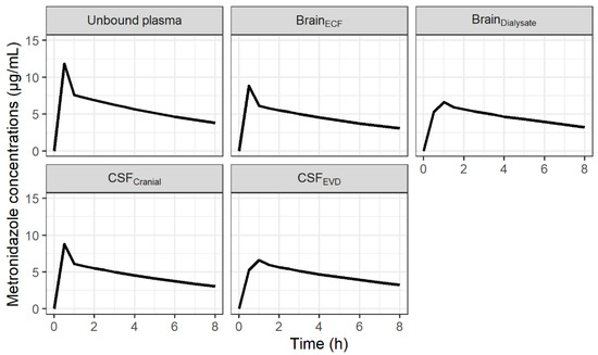 This study was performed in the neurointensive care unit at the University Hospital of Poitiers (France) and was approved by the local ethics committee (CPP OUEST III, protocol 2008-003311-12). The study design has been previously described in detail [29,30]. Briefly, eight brain-injured patients were divided into two groups based on whether they were equipped with a microdialysis probe into one of the two frontal lobes of the brain tissue (n = 4) or an EVD into their lateral brain ventricles (n = 4). The demographic characteristics are detailed in Table 3. At admission, intracranial pressure was monitored in all patients, and CT scans were monitored during their hospitalization. Patients were included in the PK study after stabilization of intracranial pressure and neurological status. All patients received 500 mg of metronidazole (B Braun, Boulogne-Billancourt, France) every 8 h through a 30-min intravenous infusion to treat a lung infection.