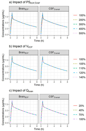 Finally, the effect of several thresholds values of Qbrain corresponding to mild hypoperfusion or oligemia (70% of normal), penumbra (40% of normal) and critical ischemia (20% of normal) [40] on metronidazole brain PK were investigated. The simulations showed no impact of Qbrain on the metronidazole profiles in ECF and CSF, which is consistent with the fact that the brain distribution is permeability-limited due to the BBB and BCSFB with their tight junctions, and not perfusion-limited (Figure 3c). In fact, despite the decrease in Qbrain, its value was still higher than that of PSECF/CSF.