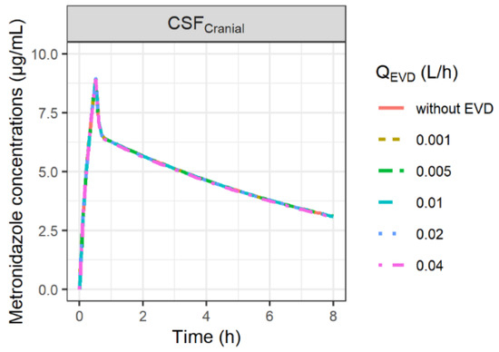 The impact of the EVD on CSF concentrations was investigated by varying QEVD from 0.001 L/h to 0.04 L/h, these two values corresponding to the minimum and the maximum flows observed during a certain time interval in a particular patient (Table S3). A simulation without EVD (QEVD = 0 L/h) was also carried out.