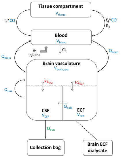 The central nervous system (CNS) is protected by physiological barriers controlling xenobiotic penetration. To act at the CNS level, drugs must have properties allowing them to cross the blood–brain barrier (BBB). Thus, compounds with limited CNS distribution are discarded during the development process. In vitro models of the BBB [1] have been designed to address this issue at the early development stage, as well as physiologically based pharmacokinetic (PBPK) models that allow the characterization in vivo of CNS distribution and interspecies extrapolations [2,3,4,5]. However, antibiotics are essentially used to treat infections localized in various organs or tissues, such as lung or peritoneal fluids, and CNS penetration is not considered a major decision criterion during antibiotic development. In fact, extensive diffusion in the CNS could rather be a problem for antibiotics such as fluoroquinolones, penicillins or carbapenems, which may induce undesirable CNS side effects [6,7,8]. Yet severe life-threatening CNS infections, such as nosocomial ventriculitis or meningitis, require rapid and aggressive antibiotic treatment that represents a real challenge [9]. These infections are increasingly caused by multidrug-resistant (MDR) bugs, and only a few antibiotics possess the appropriate microbiological spectrum to induce a rapid bactericidal effect [10,11,12]. Therapeutic options are then limited and may involve antibiotics with a priori limited CNS distribution, either because of their high hydrophilicity or/and affinity for active efflux pumps [13]. However, CNS distribution is likely to be modified in patients with brain damage and infection/inflammation due to alterations of physiological blood flows and volumes, as well as disruption of tight junctions and modifications of active transporter activity/expression. In patients with traumatic brain injury (TBI) or subarachnoid hemorrhage (SAH), an increase in intracranial pressure (ICP) due to a reduced cerebrospinal fluid (CSF) reabsorption [14] or/and a mechanisms leading to increased cerebral volumes, such as oedema or hematoma [15,16], is often observed. Moreover, in TBI and SAH patients, a decrease in cerebral blood flow [15,17,18] and an increase in permeability due to the breakdown of the BBB and the blood-cerebrospinal fluid barrier (BCSFB) have been reported [14,15]. Furthermore, patients are frequently equipped with external ventricular drains (EVD) that may also alter antibiotic exposure in CNS. Therefore, CNS distribution of antibiotics in brain-damaged patients is driven by multiple important factors that are difficult to predict. Yet CSF concentrations obtained from the EVD collection bag, close to concentrations at the infection site, are frequently used to adjust the dosing regimen for a particular patient. Traditional compartmental modeling has been frequently conducted to characterize the CNS distribution of antibiotics in brain-damaged patients [19,20,21,22,23,24]. However, PBPK modeling might be more appropriate to identify the parameters influencing antibiotic CNS distribution and to predict the impact of their pathophysiological alterations. However, any given pathophysiological alteration will not have the same impact on the CNS distribution of all antibiotics, depending on their physico-chemical characteristics. For example, increased membrane permeability due to the disruption of tight junctions is expected to have a greater effect on low- than high-permeability compounds. The same type of comment holds true for active efflux pumps. Yet among the various published brain PBPK models, some consider exclusively the BBB and not the BCSFB [2,25], which constitutes a reasonable simplification considering the authors’ objective. However, in order to attain the benefit of determining CSF concentrations in brain-damaged patients, it is necessary to develop a model including a BCSFB in addition to the BBB since exchanges exist between CSF and brain extracellular fluid (ECF). Three such PBPK models have been described in the literature [26,27,28] and were used to create the one proposed in this article, considering that our main objective was to set up a minimal PBPK including the main parameters governing antibiotics’ CNS distribution, which is likely to be altered in brain damaged patients. As a first step, we have chosen to develop this model using metronidazole, an antibiotic with extensive CNS distribution simply governed by passive diffusion, for which we had relatively rich clinical data available, including CSF concentrations in patients equipped with EVD [29] and brain ECF concentrations in patients monitored with brain microdialysis [30].