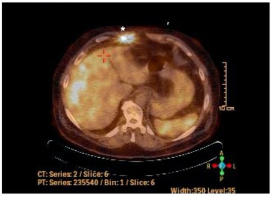 PET-CT scan of the upper abdomen before complex wound treatment. * PET positive driveline of the LVAD-System.