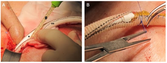 Intraoperative setup: (A) the viscous bacteriophage-rich galenic (#) was applied between the driveline (*) and the Gore® Synecore (**). (B) The Gore® Synecore was secured with sutures around the driveline before closing the wound.