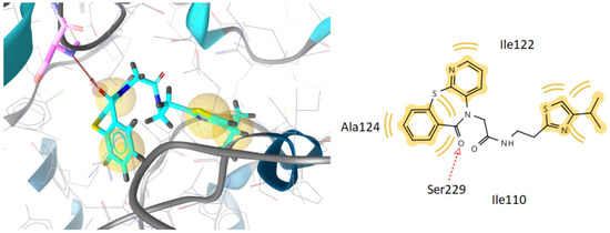 The docking pose of the most active compound 3 in E. coli MurB enzyme showed two favorable hydrogen bond interactions. The first one was between the oxygen atom of -OH group of the compound and the hydrogen of the side chain of Gly47 (distance 2.25 Å), and the other hydrogen bond interaction was between the oxygen atom of the –OCH3 group of the compound and Ser229 residue (distance 2.73 Å). The NH2 group interacts with positive ionizable interaction with the residue Glu325, stabilizing the complex compound-enzyme and playing a vital role proving the high inhibitory action of compound 3. Moreover, the hydrogen bond formation with the residue Ser229 is crucial for the inhibitory action of compound 3 as well as for compounds 2, 4, 8, and 9, because this residue takes part in the proton transfer at the second stage of peptidoglycan synthesis [60] (Figure 2 and Figure 3).