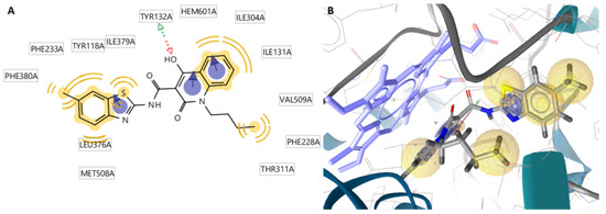 Docked conformation of the most active compound 9 in lanosterol 14α-demethylase of C. albicans (CYP51ca) (A,B). Red and green dotted arrows indicate H-bond, blue arrows indicate aromatic interactions, and yellow spheres indicate hydrophobic interactions.