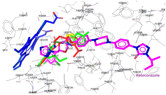 Docked conformation of ketoconazole in lanosterol 14α-demethylase of C. albicans (CYP51ca).