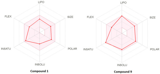 Bioavailability radar of compounds 1 and 9. The pink area represents the optimal range for each property for oral bioavailability. Lipophilicity (LIPO): XLOGP3 between −0.7 and +5.0; molecular weight (SIZE): MW between 150 and 500 g/mol; polarity (POLAR) TPSA between 20 and 130 Å2; solubility (INSOLU): log S not higher than 6; saturation (INSATU): fraction of carbons in the sp3 hybridization not less than 0.25; flexibility (FLEX): no more than 9 rotatable bonds.