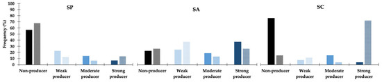 Figure 1. Effect of NaCl supplementation in biofilm production for the S. pseudintermedius (SP, n = 155), S. aureus (SA, n = 55) and S. coagulans (SC, n = 27) strains. Full-colored columns—TSB supplemented with 1% glucose (SA and SC) and 1% NaCl (SP); partially filled columns—TSB supplemented with 1% glucose and 3% NaCl (all species).
