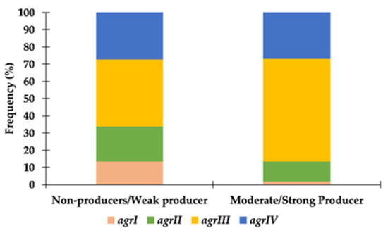 Figure 2. Distribution of S. pseudintermedius strains according to their agr type and capacity to produce biofilm.