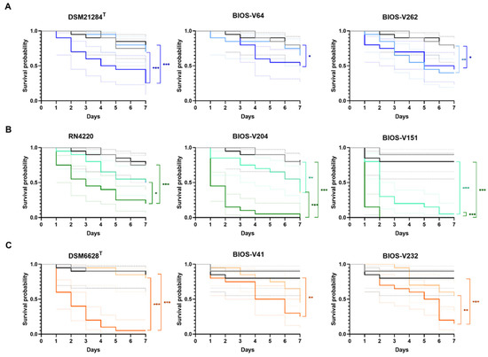 Figure 3. Kaplan–Meier survival analysis of G. mellonella infected with reference strains and biofilm-producing S. pseudintermedius (A), S. aureus (B) and S. coagulans (C) strains representative of the main clonal lineages causing animal pyoderma. Grey line: “no manipulation” control group; black line: “PBS” control group; light colors: 1 × 105 CFU/larva; dark colors: 1 × 107 CFU/larva. The colored dotted lines indicate the 95% confidence interval for the corresponding survival curve. Statistical differences are highlighted as follows: * p < 0.05; ** p < 0.01; *** p < 0.001.