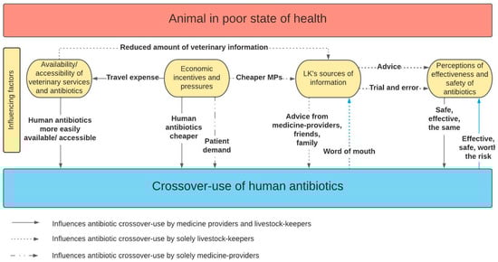 Schematic showing the factors influencing medicine-providers and livestock-keepers in partaking in the practice of crossover-use.