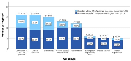 Comparison of outcomes measured by hospitals with and without an OPAT program. The percentages represent the proportion of hospitals with or without a program measuring the specific outcome, and the p-value is the significance of the comparison between these proportions.