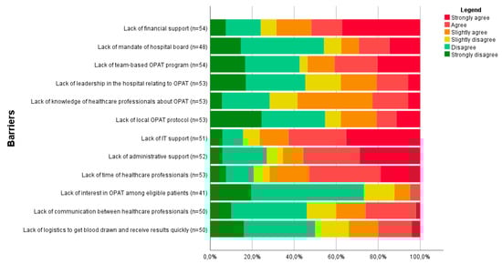 Barriers to OPAT care experienced by OPAT performing hospitals (n = 55) a. a The value ‘Do not know’ was considered as missing, resulting in different denominators per barrier.