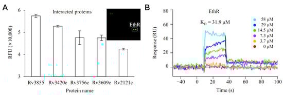 Rv0560c, confirmed to be overexpressed by PPs, was synthesized. The interaction with all proteins of M. tuberculosis was investigated using this (Figure 2). Protein microarray experiments were performed on the interaction with all proteins of M. tuberculosis. The results show that EthR had the highest interaction with Rv0560c (Figure 2A). To verify this result, Rv0560c and EthR proteins were synthesized, and direct interaction between the two proteins was tested through surface plasmon resonance (SPR) experiments (Figure 2B). EthR induced a change in refractive index when it was added to Rv0560c immobilized on a sensor surface. The KD of EthR was 31.9 μM, indicating that it could bind to Rv0560c at a low micromolar affinity.