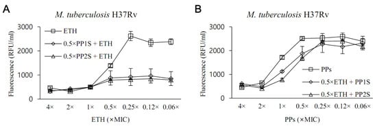 In vitro evaluation of the effect of PPs on the susceptibility of M. tuberculosis to ethionamide (ETH). Whether PPs could increase the anti-tuberculous activity of ETH was tested against the H37Rv strain. (A) In the presence of PP at 0.5× MIC, ETH significantly inhibited the growth of M. tuberculosis over concentrations ranging from 0.5× to 0.06× lower than 1× MIC (p < 0.05). (B) Conversely, no significant susceptibility-increasing effect of M. tuberculosis to ETH was observed at the various concentrations of PPs tested in the presence of 0.5× MIC of ETH (p > 0.05). Values were expressed as mean ± standard deviation, and statistical significance was determined using an unpaired Student’s t-test by comparing fluorescence values of samples treated with either ETH or PPs alone.