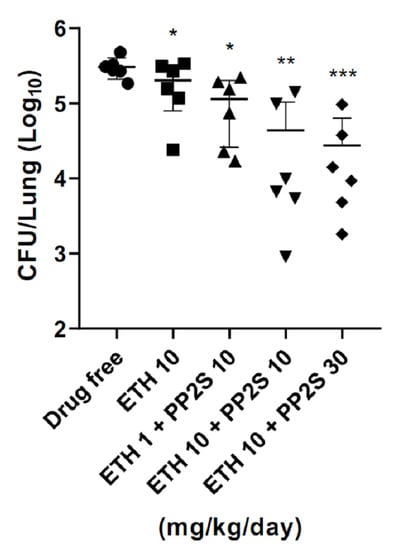 Synergistic effect of PPs and ethionamide (ETH) in the pulmonary tuberculosis mouse model. In the mouse model infected with M. tuberculosis, the load of M. tuberculosis in the lungs was lower in the group administered with PP2S and ETH in combination than in the group administered with ETH alone. Data are expressed as mean ± standard deviation. Student’s t-test was used to compare groups (* p < 0.05, ** p < 0.01, *** p < 0.001).