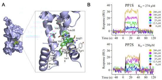 Interaction between PPs and Rv2887 protein. The interaction between PPs and Rv2887 protein was confirmed by (A) in silico and (B) SPR experiments. As the PPs increased to 200 μM, the response value increased concentration-dependently. Here, PP1S and PP2S have molecular weights of 423 and 465, respectively, and 200 μM represents 84.6 and 93.0 μg/mL, respectively.