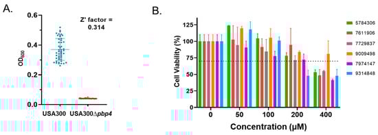 S. aureus PBP4 screening strategy and mammalian cell cytotoxicity of prioritized hits. Panel (A). Growth of strains USA300 and USA300∆pbp4 in media supplemented with 2 µg/mL ciprofloxacin (48 replicates each). Panel (B). HepG2 cytotoxicity measures of 0, 50, 100, 200, and 400 µM of prioritized screening hits; standard deviation shown.