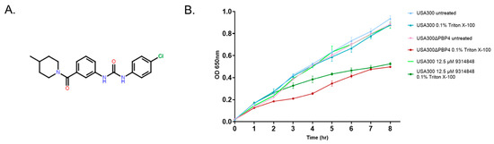 Characterization of highest priority putative S. aureus PBP4 inhibitor. Panel (A). Chemical structure of ChemBridge compound 9314848. Panel (B). Growth measures of S. aureus strains USA300, USA300∆pbp4, and 9314848 treated cells in the absence and presence of 0.1% of Triton-X100.
