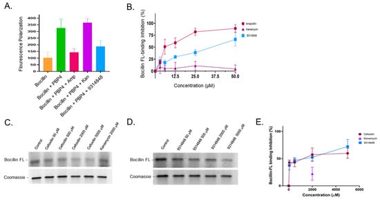 PBP4 binding assays. Panel (A). Fluorescence polarization of BOCILLIN FL (alone) and in the presence of Bacillus subtilis PBP4 following mock treatment or treatment with 50 µM of either ampicillin, kanamycin, or 9314848. Panel (B). Percent PBP4 BOCILLIN FL binding inhibition following pre-treatment with 0, 3.1, 6.2, 12.5, 25.0, or 50.0 µM ampicillin, kanamycin, or 9314848. Panel (C). Top—gel electrophoresis and fluorescent detection of BOCILLIN FL labeled PBP4 following treatment with 0 (control), 50, 500, 2000, or 5000 µM cefoxitin or 2000 µM kanamycin; Bottom—same gel Coomassie blue stained to control for loading. Panel (D). Top—gel electrophoresis and fluorescent detection of BOCILLIN FL labeled PBP4 following treatment with 0 (control), 50, 500, 2000, or 5000 µM 9314848; Bottom—same gel Coomassie blue stained. Panel (E). Graphed are the average gel-based BOCILLIN FL inhibition measures from 3 independent experiments; standard deviations shown.