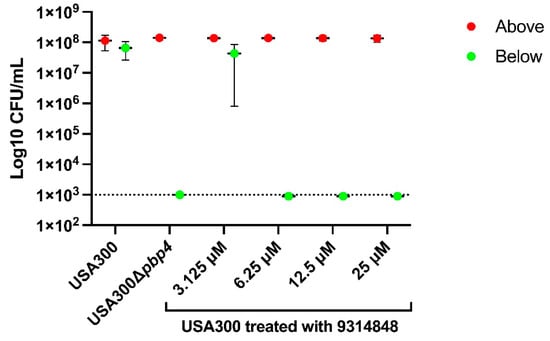 µSiM-CA assays. Enumeration of wild type USA300, USA300∆pbp4, and wild type cells treated with 0, 3.1, 6.2, 12.5, 25.0, or 50.0 µM 9314848 recovered.