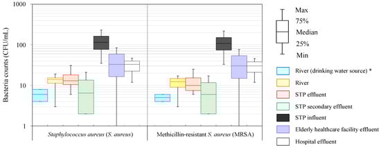 Distribution of Staphylococcus aureus (S. aureus) and methicillin-resistant Staphylococcus aureus (MRSA) in hospital effluent, elderly healthcare facility effluent, sewage treatment plant (STP) influent, STP effluent, and river water (*: The river water as a drinking water source was supplied to the study area and neighboring regions).