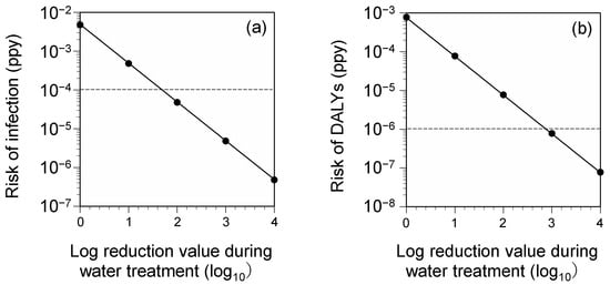 The risk of infection and DALYs showed a linear reduction with inactivation during the drinking-water treatment process (Figure 2). However, to achieve the established benchmarks, it was calculated that the water treatment process would need to achieve 1.7 log10 and 2.9 log10 inactivation in terms of infection risk and DALYs, respectively. In the water purification process, the concentration-time (CT) value (mg∙min/L) of free chlorine required for a 3 log10 inactivation reduction is approximately 0.5 [60], which is considered to be a sufficiently achievable level for water treatment in Japan, where chlorine-free treatment is generally applied.