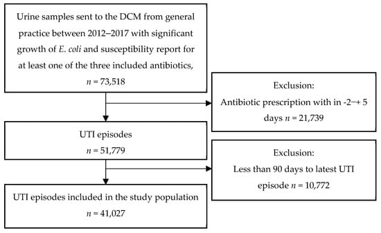 Within the study period, we identified 51,779 UTI episodes, defined as urine samples with significant growth of E. coli and concurrent antibiotic prescription for UTI. After exclusion of 10,752 urine samples, where a full exposure period was not available (i.e., there was less than 90 days to the previous UTI episode), 41,027 UTI episodes were included in the study. The inclusion of urine samples is shown in Figure 2 below. The median age of the patients included in the study was 78 years (interquartile range: 71–85) and 84% were female. Baseline characteristics are provided in Table 1. For each analysis we excluded a number of observations due to missing information regarding susceptibility for the specific antibiotic in question; mecillinam: 91, trimethoprim: 71, nitrofurantoin: 2570. For multi-resistance 14,101 samples were not fully susceptible or had missing information of the susceptibility pattern for one or more of the three antibiotics and were therefore excluded from the analysis. In our study material we found the following resistance rates: mecillinam 4.5%, trimethoprim 26.3%, nitrofurantoin 2.3%, and multi-resistance 0.3%.