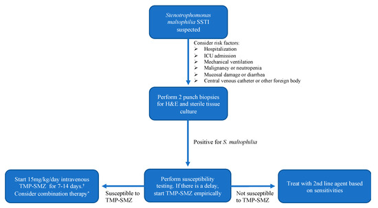 Diagnostic and treatment algorithm for the patient with suspected S. maltophilia SSTI. † In the case of sulfonamide allergy, desensitization may be pursued. If this is not possible, treatment with levofloxacin or minocycline should be initiated if the culture demonstrates sensitivity. * Consider combination therapy such as trimethoprim–sulfamethoxazole plus a third-generation cephalosporin or extended-spectrum penicillin [15].