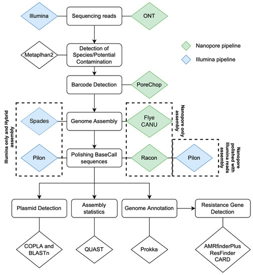 The bioinformatics pipeline used for the total genomic and plasmid DNA sequencing analysis. The total genomic DNA and plasmid-only DNA were sequenced using two sequencing chemistries (Illumina and Oxford Nanopore Technologies (ONT)). Reads were assembled using four different approaches: Nanopore-only: MinION reads were assembled with Flye, without error correction by Illumina reads; Nanopore-polished: MinION reads were assembled with Flye and polished with Illumina reads; and Illumina-only: Illumina reads were assembled with SPADES, without error correction with Nanopore reads. Illumina-hybrid: assembly of Illumina reads and Nanopore reads with hybridSPADES and polished with Illumina reads. Blue triangles: Illumina. Green triangles: ONT. AMR genes were identified using three different databases: AMRfinder database [16], Resfinder database [19], and CARD [14]. Metaphlan2 [20], Porechop (https://github.com/rrwick/Porechop accessed on 11 September 2022), Flye [21], Spades [22], Canu [23], Pilon [24], Racon [25], PlasmidSPAdes [26], Prokka [27], Copla [28].