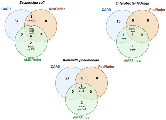 To evaluate the efficiency with which AMR genes could be detected from different publicly available databases, the gene symbol output obtained from each database in total-genomic preparations were compared. Most genes called by AMRFinder and ResFinder were identical (n = 7), with 14 genes in total being called by AMRFinder and 9 genes in total called by ResFinder, while CARD called 88 AMR genes among the three bacterial strains (Figure 3; Tables S6–S8). Besides having great database resources, these results highlight the stringent search of AMRFinder and ResFinder, which contributes to avoid false positives. In contrast, CARD uses less stringent cut-off thresholds, increasing false positives and overcalling resistance.