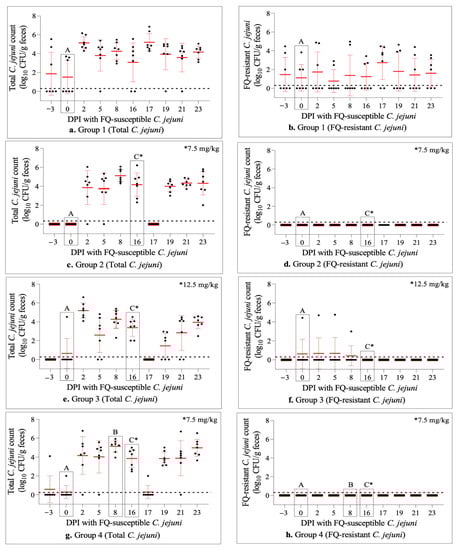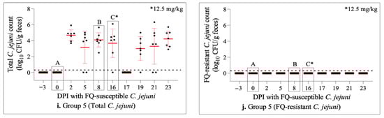 Dot plot analysis of Campylobacter colonization level (log10 CFU/g feces) in cattle of groups 1–5. Panels (a,c,e,g,i) represent total C. jejuni CFUs (both susceptible and resistant), while (b,d,f,h,j) indicate FQ-resistant C. jejuni population. Each dot indicates the CFU number from an individual calf. The horizontal red bars depict the mean colonization levels, while the vertical red lines show the 95% confidence interval. Letter A designates the time when all calves were orally inoculated with FQ-susceptible C. jejuni, letter B denotes the time when M. haemolytica was given to the calves in Groups 4 and 5, and letter C depicts the day on which groups 2, 3, 4, and 5 received subcutaneous injection of enrofloxacin. The culture’s detection limit was approximately 100 CFU/g of feces (shown as dotted black lines over x-axis). DPI stands for day after inoculation.