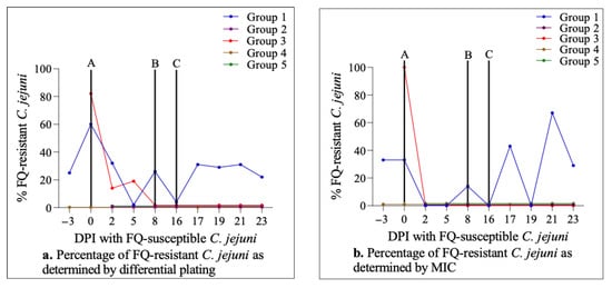The proportions of FQ-resistant C. jejuni colonies in colonized calves as determined by differential plating (a) and MIC assays (b). The 5 groups are represented by lines of different colors. See the legend of Figure 1 for letters A, B, and C.