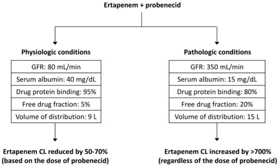 In physiologic conditions (left side), concomitant administration of probenecid resulted in a dose-dependent reduction (50–70%) in the clearance (CL) of ertapenem. In pathologic conditions (right side), the presence of a severe hypoalbuminemia resulted in a 400% increase in the ertapenem free fraction available for renal excretion. This effect was amplified by the presence of augmented renal clearance (400% increase in the glomerular filtration rate, GFR). Moreover, the patient also gained 6 L of fluids, further diluting the concentrations of ertapenem (the volume of distribution increased by 40%). The net result is a severe reduction in the CL of ertapenem related to the pathological conditions associated with ICU which greatly outweigh the effect of the pDDI related to concomitant probenecid administration.