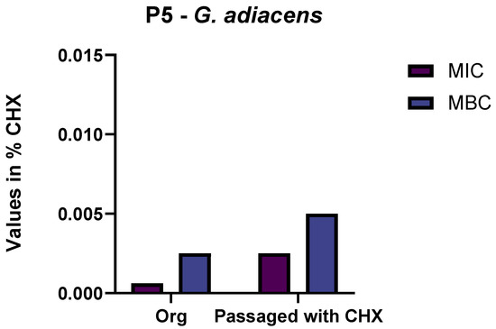 Minimum inhibitory concentration (MIC) and minimum bactericidal concentration (MBC) of G. adiacens isolated before (Org) and after passaging, with and without the addition of chlorhexidine (CHX). Values are depicted in percent of CHX. P5: Proband 5.
