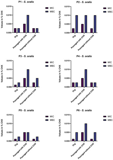 2.3. Minimum Inhibitory Concentrations (MICs) of Bacterial Isolates before and after Passaging with CHX