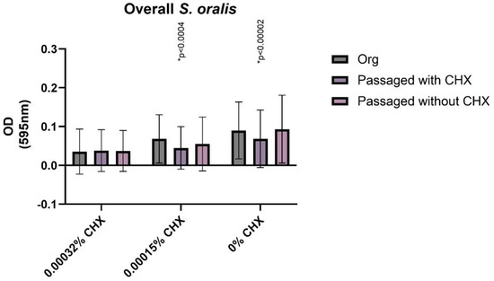 Biofilm formation at different subinhibitory concentrations of chlorhexidine (CHX). Graphical illustration of the biofilm formation (OD values) of S. oralis isolates exposed to subinhibitory concentrations of CHX. The percentages of CHX are shown on the X-axis, and the OD values are shown on the Y-axis. p-values in comparison to the original isolate (* significant difference).
