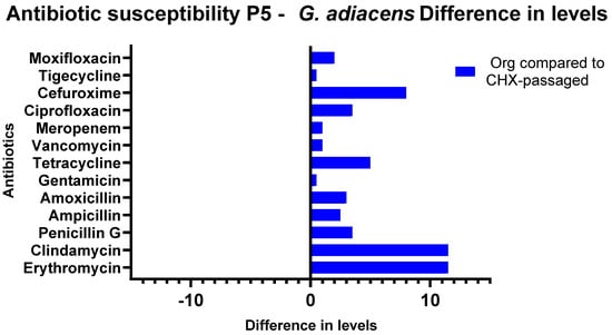 Antibiotic susceptibility testing of G. adiacens isolates from Subject 5. Graphical depiction of the difference in susceptibilities in levels between the original isolate and the isolates after passaging with CHX. The levels are drawn on the X-axes, and the antibiotics are shown on the Y-axes. P5: Proband 5.