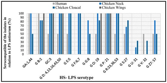 The serology assay used to confirm the identity of C. jejuni was performed by the Penner system, which is based on the detection of 25 heat-stable (HS) antigens []. The human and chicken isolates shared a complete serotype homology for P: 21, while serotypes C: 3 and D: 4, 13, 16, 43, 50 were shared by 93.3% of these isolates. The serotypes F: 6, 17; G: 8; U: 31 were predominant in poultry isolates, with a serohomology of C. jejuni between human and chicken samples in 71% for necks, 78% for cloaca, and 36% for wings. The finding is similar to the serotypes reported in clinical samples, bovine and poultry [,]. The isolates of C. jejuni exhibited a limited HS antigenic variant and thus had no interaction with all the antisera used in the serological examination. The association between human infection and poultry handling most likely is due to the endemic colonization of C. jejuni in poultry flocks []. The sharing of many HS antigenic determinants suggests a link between poultry food products and human infections.