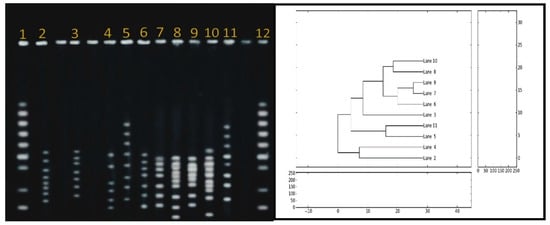 Dendogram with the percentage similarity among the DNA profiles of Campylobacter jejune isolated from human and poultry sources. The similarity index was estimated using the Jaccard coefficient and the dendogram was generated through UPGMA method using python version 2.6.5. Lanes 1 and 12, DNA markers; Lanes 7 and 9, human samples; Lanes 2, 3, 5, 6, 11, poultry necks; Lane 4, chicken wings; Lanes 8 and 10, poultry cloaca.