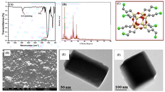 FTIR spectroscopy was used to confirm the synthesis of the fn-POSS, as shown in Figure 1A. The Si-O-Si and C-O stretching vibrations are represented by the two sharpest peaks in the FTIR, which are at 1110 cm−1 and 970 cm−1, respectively. By bending CH2, the FTIR peak at 1487 cm−1 is formed. There is confirmation of the Si-O-Si, C-O vibration in the peaks at 795 and 650 cm−1, accordingly. The fn-POSS revealed a spectrum at 3000 cm−1 which was linked to the -OH groups’ distortion, perhaps as a result of the absorbed water molecules. The (101), (004), and (200) crystal planes are indicated by the diffraction peaks at 25.3°, 38.3°, and 48.0°. Figure 1B depicts the final structure. This is confirmed by the fn-3D POSS’s chemical structure, which is shown in Figure 1C. Figure 1D shows SEM images of fn-POSS. The standard size of the cubic form of fn-POSS is 50 nm. In Figure 1E,F, TEM images of fn-POSS are depicted. Strong intra- and intermolecular interaction with fn-POSS led the particles to cluster in the image, giving the appearance of them clustered. The ImageJ program was used to determine the average fn-POSS’s diameter which was around 50 nm. The long cubic shape of the fn-POSS encourages a strong tie to the matrix and provides a barrier for O2 and H2O.