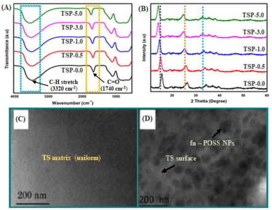 Structural and morphological characterizations of TS/fn-POSS nanocomposite films with different amounts of fn-POSS: (A) FTIR spectra; (B) XRD patterns, (C,D) TEM images. The fn-POSS content of nanocomposite is 0.0 and 3.0 wt.% for the TEM images.