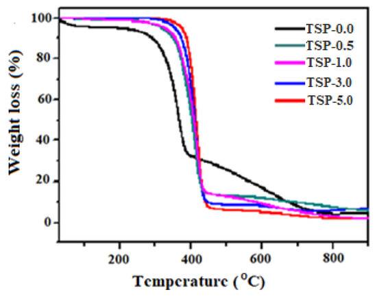 Figure 4 shows TGA thermograms for TS and TS/fn-POSS nanocomposites, while the corresponding data are shown in Table S1. The initial degradation of the TS and TS/fn-POSS composites from 220–350 °C may be commended for the evaporation of water and reduction of volatile compounds. With a weight loss of 39.2%, the TS matrix (TSP-0.0) showed the second stage of degradation at 382–460 °C, which was driven by the thermal degradation of the acetal groups in TS. The onset of thermal degradation of the TSP-0.5, TSP-1.0, TSP-3.0, and TSP-5.0 was further increased by the addition of 0.5, 1.0, 3.0, and 5.0 wt.% of fn-POSS at 225, 247, 275, and 350 °C, respectively. This could be a function of the composite film’s hydrogen bonds between molecules and the interactions of a coordination character between the TS’s OH groups and the methyl groups of the fn-POSS. In comparison to the TS matrix, the thermal stability of TSP-1.0, TSP-3.0, and TSP-5.0 composites was increased by about 17–29%. According to our study, the higher thermal degradation temperatures for TS/fn-POSS composites are explained due to the fn-POSS NPs’ hugely increased surface area (smaller size) as more normally found within the TS matrix. The residual weight increased as even more nanoparticles were introduced to the polymer matrix, as can be seen in the results below.