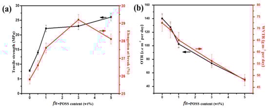 (a) Tensile strength and Elongation at the break vs. fn-POSS content; (b) OTR and WVTR values vs. fn-POSS content.