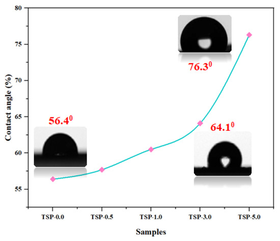 To study the surface characteristics of TS/fn-POSS composites and identify the effects of the filler content, wettability measurements, or WCA, were performed. Figure 6 shows the water contact angle values and measurements taken with distilled water as the probing liquid. The hydrophobic characteristic of neat TS is testified to by its contact angle of 56.4°. This increased significantly with increased fn-POSS content, showing the presence of the filler at the film-air interaction and that the hydrophobic characteristics of the material have also enhanced (because there are propyl and silica groups from the filler). The WCA value of the TS/fn-POSS (TSP-5) nanocomposite film is 76.3° (Oliveira et al. have observed similar results) [42].