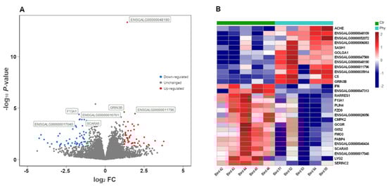 Effects of PFA supplementation on ileum gene expression. (A) Volcano plot of genes showing differentially expressed genes, red = upregulated, blue = downregulated, grey = unchanged. (B) Heatmap showing the most differentially expressed genes.